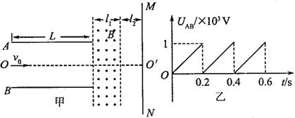 如图甲所示,两平行金属板AB间接有如图乙所示的电压,两板间的电场可看作匀强电场,且两板外无电场,板长L=0.8 m,板间距离d=0.6 m。在金属板右侧有一磁感应强度B=2.0×10-2 T,方向垂直纸面向外的匀强磁场,磁场宽度为l1=0.12 m,磁场足够长。MN为一竖直放置的足够大的荧光屏,荧光屏距磁场右边界的距离为l2=0.08 m,MN及磁场边界均与AB两板中线OO’垂直。现有带正电的粒子流由金属板左侧沿中线OO’连续射入电场中。已知每个粒子的速度v0=4.0×105 m/s,比荷