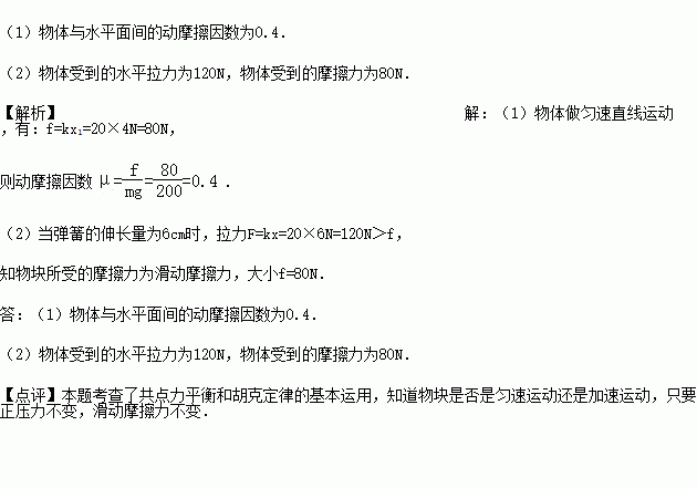 (2)当弹簧的伸长量为6cm时(未超出弹性限度),物体受到的水平拉力是多大?这时物体受到的摩擦力是多大?