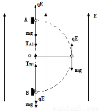 。此后小球在A、B之间的右侧区域竖直面内做圆周运动,并不时与A、B挡板碰撞,在小球与A、B挡板碰撞时,通过两挡板上安装的传感器和控制电路,控制电场方向在碰后瞬间反向,不计碰撞中的能量损失,重力加速度为g,求:
