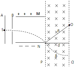 (2012?佛山一模)如图所示,一质量为m、电量为+q、重力不计的带电粒子,从A板的S点由静止开始释放,经A、B加速电场加速后,穿过中间偏转电场,再进入右侧匀强磁场区域.已知AB间的电压为U,MN极板间的电压为2U,MN两板间的距离和板长均为L,磁场垂直纸面向里、磁感应强度为B、有理想边界.求: