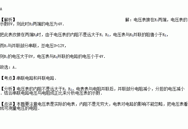 如图所示,两个定值电阻R1、R2串联后接在电压U稳定于12V的直流电源上,有人把一个内阻不是远大于R1、R2的电压表接在R1两端,电压表的示数为8V.如果他把电压表改接在R2两端,则电压表的示数将( )