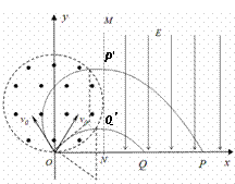 (3)由题意分析可知,当粒子沿着y轴两侧300角射入时,将会沿着水平方向射出磁场区域,之后垂直虚线MN分别从P' 、Q'射入电场区,做类平抛运动,最终到达x轴的位置分别为最远位置P和最近位置Q。 ![]()