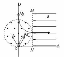为圆心,半径r=0.1m的圆形区域内只存在垂直纸面向外的匀强磁场,圆形区域的最下端与xoy坐标系的x轴相切于坐标原点O,圆形区域的右端与平行y轴的虚线MN相切,在虚线MN右侧x轴的上方足够大的范围内有方向水平向左的匀强电场,电场强度E=1.0×105 N/C。现从坐标原点O沿xoy平面在y轴两侧各30°角的范围内发射速率均为v0=1.0×106m/s的带正电粒子,粒子在磁场中的偏转半径也为r=0.1m,已知粒子的比荷