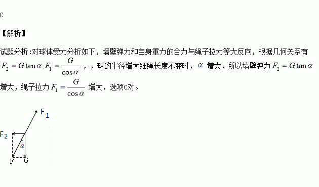 如图所示,将一球用网兜挂在光滑的墙壁上,设绳对球的拉力为F1,墙壁对球的支持力为F2,当球的半径增大时(设绳长、球的质量不变)( )