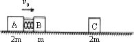 如图所示,光滑水平直轨道上有三个滑块A、B、C,质量分别为mA=mC=2m,mB=m,A、B用细绳连接,中间一压缩的轻弹簧(弹簧与.滑块不栓接),开始时A、B以共同速度v0运动,C静止,某时刻细绳突然断开,A、B被弹开,然后B又与C发生碰撞并粘在一起,最终三滑块速度恰好相同,求B与C碰撞前B的速度.