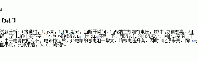 如图所示,L1、L2、L3是完全相同的灯泡,L为直流电阻可忽略的自感线圈,开关S原来接通,当开关S断开时,下面说法正确的是(考虑电源内阻) ( )