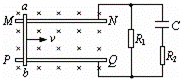 如图所示的电路中,匀强磁场的磁感应强度为B,在同一水平面上固定着平行金属轨道MN和PQ,两轨道间的距离为l.金属杆ab沿垂直轨道方向放置在两轨道上,金属杆ab在MN和PQ间的电阻为r,且与轨道接触良好.R1=R2=R,电容器的电容为C,轨道光滑且不计轨道的电阻.若金属杆ab在某一水平拉力的作用下以速度v沿金属轨道向右做匀速直线运动.