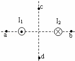 Á½¸ùͨµçµÄ³¤Ö±µ¼Ï߯½ÐзÅÖ㬵çÁ÷´óСI1£¾I2£¬µçÁ÷µÄ·½ÏòÈçͼËùʾ£¬ÔÚÓëµ¼Ïß´¹Ö±µÄÆ½ÃæÉÏÓÐa¡¢b¡¢c¡¢dËĵ㣬ÆäÖÐa¡¢bÔÚµ¼Ïßºá½ØÃæÁ¬½ÓµÄÑÓ³¤ÏßÉÏ£¬c¡¢dÔÚµ¼Ïßºá½ØÃæÁ¬½ÓµÄ´¹Ö±Æ½·ÖÏßÉÏ£®Ôòµ¼ÌåÖеĵçÁ÷ÔÚÕâËĵã²úÉúµÄ´Å³¡µÄ´Å¸ÐӦǿ¶È¿ÉÄÜΪÁãµÄÊÇ£¨¡¡¡¡£©