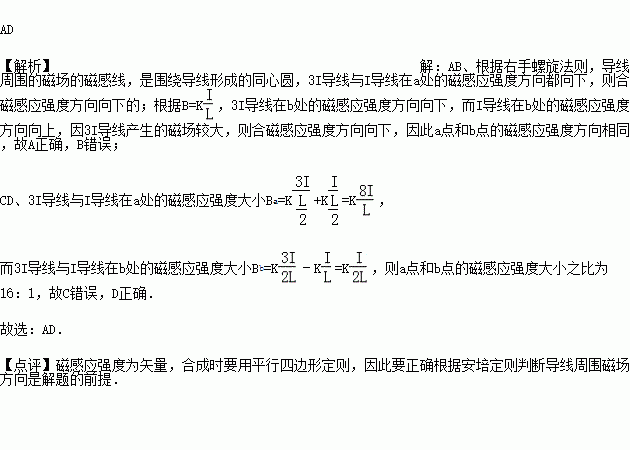 (式中k为常数).如图所示,两根相距L的无限长直导线分别通有电流I和3I.在两根导线的连线上有a、b两点,a点为两根直导线连线的中点,b点距电流为I的导线的距离为L.下列说法正确的是( )