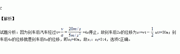 汽车以20m/s的速度做匀速直线运动,刹车后的加速度为5m/s2,那么开始刹车后2秒与开始刹车后6秒汽车通过的位移之比为( )