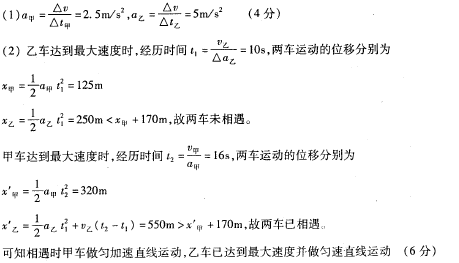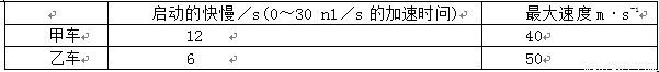 下表为甲乙两汽车的性能指标。开始时两车静止在同一条平直公路上,甲车在前乙车在后,两车相距170m。某时刻起两车向同一方向同时启动,若两车由静止开始运动到最大速度的时间内都以最大加速度(启动时的加速度)做匀加速直线运动。