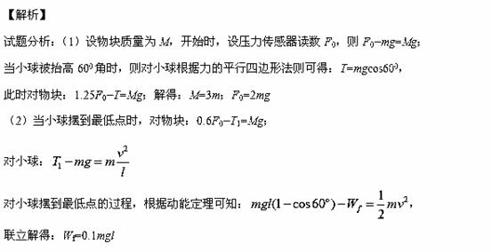 如图甲所示,物块与质量为m的小球通过不可伸长的轻质细绳跨过两等高定滑轮连接。物块置于左侧滑轮正下方的表面水平的压力传感装置上,小球与右侧滑轮的距离为l。开始时物块和小球均静止,将此时传感装置的示数记为初始值。现给小球施加一始终垂直于l段细绳的力,将小球缓慢拉起至细绳与竖直方向成60o角,如图乙所示,此时传感装置的示数为初始值的1.25倍;再将小球由静止释放,当运动至最低位置时,传感装置的示数为初始值的0.6倍.不计滑轮的大小和摩擦,重力加速度的大小为g。求: