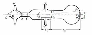 汤姆孙测定电子比荷(电子的电荷量与质量之比)的实验装置如图所示。真空玻璃管内,阴极K发出的电子经加速后,穿过小孔A、C沿中心轴线OP1进入到两块水平正对放置的极板D1、D2间的区域,射出后到达右端的荧光屏上形成光点。若极板D1、D2间无电压,电子将打在荧光屏上的中心P1点;若在极板间施加偏转电压U,则电子将打P2点,P2与P1点的竖直间距为b,水平间距可忽略不计。若再在极板间施加一个方向垂直于纸面向外、磁感应强度为B的匀强磁场(图中未画出),则电子在荧光屏上产生的光点又回到P1点。已知极板的长度为L1,极板间的距离为d,极板右端到荧光屏间的距离为L2。忽略电子的重力及电子间的相互作用。