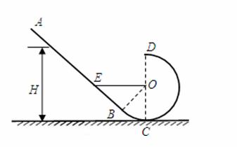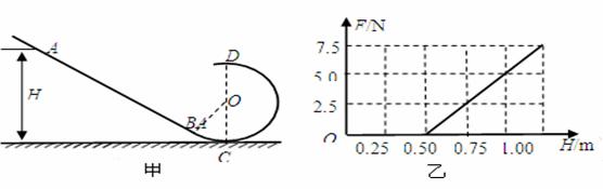 如图甲所示,竖直平面内的光滑轨道由倾斜直轨道AB和圆轨道BCD组成,AB和BCD相切于B点,CD连线是圆轨道竖直方向的直径(C,D为圆轨道的最低点和最高点),且∠BOC=θ=37°,圆轨道直径d为0.4m。可视为质点,质量m=0.1kg的小滑块从轨道AB上高H处的某点由静止滑下,(已知sin37°=0.6,cos37°=0.8,g=10m/s2)求: