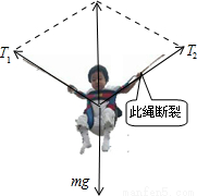 则每根橡皮绳所受拉力将变小,故B选项正确;当右侧橡皮条拉力变为零时,左侧橡皮条拉力不变,重力也不变;由于三力平衡时,三个力中任意两个力的合力与第三个力等值、反向、共线,故左侧橡皮条拉力与重力的合力与右侧橡皮条断开前的弹力反方向,大小等于mg,故加速度为g,方向沿原断裂绳的方向斜向下,故C选项错误;若拴在腰间左右两侧的是悬点等高、完全相同的两根轻绳,则小明左侧轻绳在腰间断裂时,小明以右侧轻绳悬点为圆心向下运动此时的加速度为沿圆周切线方向, 由牛顿第二定律