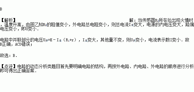 如图甲所示是一火警报警器的部分电路示意图,其中R2为半导体热敏材料制成的传感器,其电阻R2随温度t变化的图线如图乙所示.电流表为值班室的显示器,a、b之间接报警器.当传感器R2所在处出现火情时,显示器的电流I和报警器两端的电压U的变化情况是( )