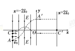 如图所示的直角坐标系中,在直线x=-2l0到y轴区域内存在着两个大小相等、方向相反的有界匀强电场,其中x轴上方的电场方向沿y轴负方向,x轴下方的电场方向沿y轴正方向。在电场左边界上A(-2l0,- l0)到C(-2l0,0)区域内,连续分布着电荷量为+q、质量为m的粒子。从某时刻起由A点到C点间的粒子,依次连续以相同的速度v0沿x轴正方向射入电场。若从A点射入的粒子,恰好从y轴上的A′(0,l0)沿x轴正方向射出电场,其轨迹如图虚线所示。不计粒子的重力及它们间的相互作用。求