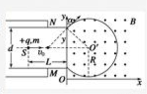 ÈçͼËùʾ£¬ÔÚÆ½ÃæÖ±½Ç×ø±êϵxOyµÚÒ»ÏóÏÞÄÚ·Ö²¼Óд¹Ö±xOyÏòÍâµÄÔÈÇ¿´Å³¡£¬´Å¸ÐӦǿ¶È´óСB£½2.5¡Á10-2 T£®ÔÚµÚ¶þÏóÏÞ½ôÌùyÖá²¢´¹Ö±yÖá·ÅÖÃÒ»¶ÔƽÐнðÊô°åMN£¬¼«°å¼ä¾àd£½0.4 m£¬MNÖÐÐÄÖáÏßÀëxÖá0.3 m£®¼«°åÓë×ó²àµç·ÏàÁ¬½Ó£¬Í¨¹ýÒÆ¶¯»¬¶¯Í·P¿ÉÒԸı伫°åMN¼äµÄµçѹ¡£a¡¢bΪ»¬¶¯±ä×èÆ÷µÄ×î϶˺Í×îÉ϶ˣ¨»¬¶¯±ä×èÆ÷µÄ×èÖµ·Ö²¼¾ùÔÈ£©£¬a¡¢bÁ½¶ËËù¼ÓµçѹU£½1¡Á102 V¡£ÔÚMNÖÐÐÄÖáÏßÉϾàyÖá¾àÀëΪL£½0.4 m´¦£¬ÓÐÒ»Á£×ÓÔ´SÑØxÖáÕý·½ÏòÁ¬ÐøÉä³ö±ÈºÉΪ