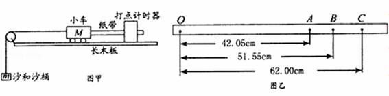 (4)在此试验中,该同学先接通计时器的电源(频率为50Hz),再放开纸带,图乙所示是在m=100g,M=1kg情况下打出的一条纸带,O为起点,A、B、C为过程中的三个相邻的计数点,相邻的计数点之间有四个点没有标出,有关数据如图乙所示,其中hA=42.05cm,hB=51.55cm,hC=62.00cm,则打B点时小车的速vB= _________ m/s,小车的加速度为a= _________ m/s2.(结果保留两位有效数字)