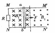 如图所示,水平放置的光滑金属长导轨MM’和NN'之间接有电阻R,导轨左、右两区域分别存在方向相反且与导轨平面垂直的匀强磁场,设左、右区域磁场的磁感应强度大小分别为B1和B2,虚线为两区域的分界线。一根阻值也为R的金属棒ab放在导轨上并与其垂直,导轨电阻不计,若金属棒ab在恒定外力F的作用下从左边的磁场区域距离磁场边界x处匀速运动到右边的磁场区域距离磁场边界x处,下列说法中正确的是( )