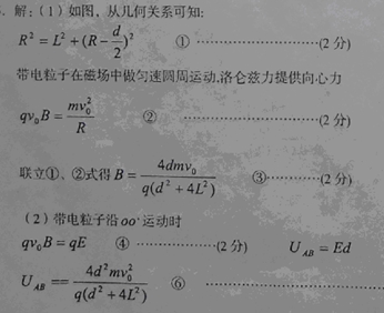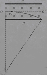 如图所示,长为L的两平行金属板A、B相距d水平放置,板间充满图示的匀强磁场。质量为m、电量为q的粒子(不考虑重力)以速度V0滑两平行板中央O点入射,刚好从B板有边飞出。求: