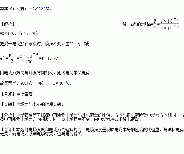 电量为+2×10﹣6C的点电荷放入电场中A点,受到作用力为4×10﹣4N,方向水平向右,则A点的场强大小为 ,方向 .若把另一电荷放在该点受到的作用力为2×10﹣4N,方向水平向左,则这个电荷的电量为 .