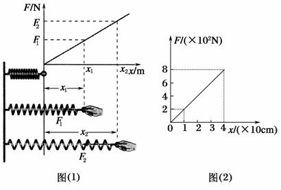 如下图(1)和图(2)所示,是探究某根弹簧的伸长量x与所受拉力F之间的关系图,下列说法中正确的是( )