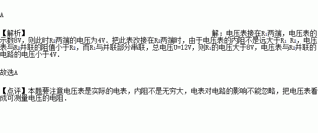 如图,两个定值电阻R1 R2串联后接在输出电压U稳定于12V的直流电源中.有人把一个内阻不是远大于R1 R2的电压表接在R1两端,电压表的示数8V,如果他把此表改接在两端R2,则电压表的示数( )