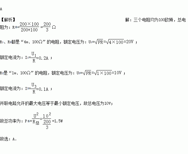 如图所示的电路中,R1、R2都是“4w、100Ω”的电阻,R3是“1w、100Ω”的电阻,则AB间允许消耗的最大功率是( )