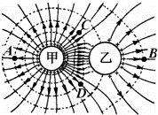 空间存在甲、乙两相邻的金属球,甲球带正电,乙球原来不带电,由于静电感应,两球在空间形成了如图所示稳定的静电场.实线为其电场线,虚线为其等势线,A、B两点与两球球心连线位于同一直线上,C、D两点关于直线AB对称,则( )