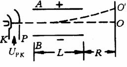 如图11所示电子射线管.阴极K发射电子,阳极P和阴极K间 加上电压后电子被加速。A、B是偏向板,使飞进的电子偏离.若已知P、K间所加电压UPK=2.5×103V,两极板长度L=6.0×10-2m,板间距离d=10-2m,所加电压UAB=100V,R=14×10-2m, 电子质量me=9.1×10-31kg,电子的电荷量e=-1.6×10-19C。设从阴极出来的电子速度为0,不计重力。 试问: