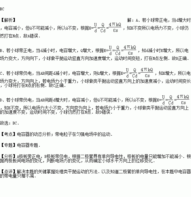 如图,平行板电容器AB两极板水平放置,现将其和理想二极管串联接在电源上,已知A和正极相连,二极管具有单向导电性,一带电小球沿AB中心水平射入,打在B极板上的N点.现通过上下移动A板来改变两极板的间距(两板仍平行),则下列说法中正确的是( )