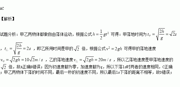 甲乙两物体分别从高10m处和高20m处同时由静止自由下落,不计空气阻力,下列几种说法中正确的是