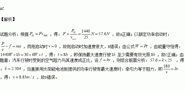 有一辆质量为170kg、输出功率为1440W的太阳能试验汽车,安装有约6m2的太阳能电池板和蓄能电池,该电池板在有效光照条件下单位面积输出的电功率为30W/ m2。若驾驶员的质量为70kg,汽车最大行驶速度为90km/h。假设汽车行驶时受到的空气阻力与其速度成正比,则汽车