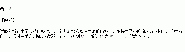 在用阴极射线管研究磁场对运动电荷作用的实验中,将阴极射线管的A.B两极连在高压直流电源的正负两极上,从A极发射出电子,当将一蹄形磁铁放置于阴极射线管两侧,显示出电子束的径迹如图所示,则阴极射线管的A极应接在电源 极上(选填“正”或者“负”):踢形磁铁的C端为 极(选填“N”或者“S”)