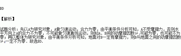 如图所示,C 是水平地面,A、B是两个长方形物块,F是作用在物块B上沿水平方向的力,物体A和B以相同的速度作匀速直线运动。由此可知,A、B间的动摩擦因数μ1和B、C间的动摩擦因数μ2有可能的是( )