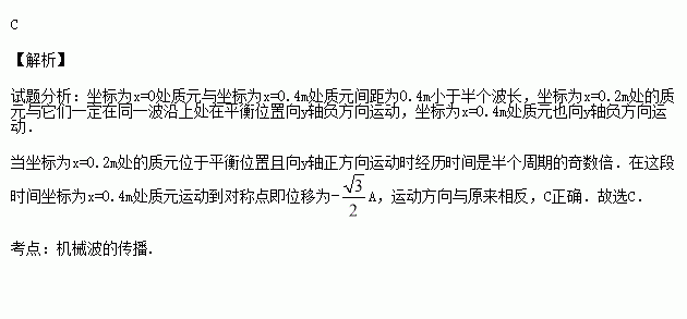 。当坐标为x=0.2m处的质元位于平衡位置且向y轴正方向运动时,x=0.4m处质元的位移和运动方向分别为