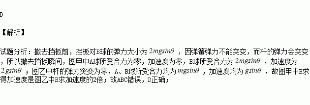 ,图甲中,A、B两球用轻弹簧相连,图乙中A、B两球用轻质杆相连,系统静止时,挡板C与斜面垂直,弹簧、轻杆均与斜面平行,则在突然撤去挡板的瞬间有( )