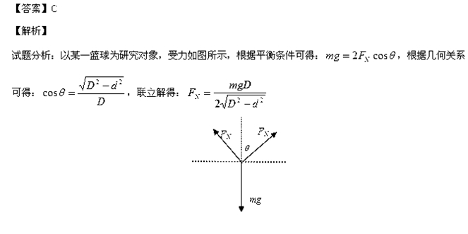 体育器材室里,篮球摆放在图示的球架上。已知球架的宽度为d,每只篮球的质量为m、直径为D,不计球与球架之间摩擦,则每只篮球对一侧球架的压力大小为( )