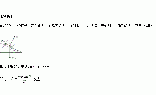 的光滑斜面上垂直纸面放置—根长为L,质量为m的直导体棒,有一匀强磁场垂直于斜面,当导体棒内通有垂直纸面向里的电流I时,导体棒恰好静止在斜面上(重力加速度为g)则( )