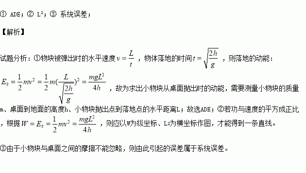 ②将几次实验中橡皮筋对小物块做功分别记为W1、W2、W3、……,小物块抛出点到落地点的水平距离分别记为L1、L2、L3、……。若功与速度的平方成正比,则应以W为纵坐标、 为横坐标作图,才能得到一条直线。
