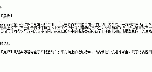 长江三峡位于我国的腹地,它西起重庆奉节的白帝城,东到湖北宜昌的南津关,是我国的一个重要旅游地区,三峡索道的建成,为三峡旅游区又增添了一道亮丽的风景线.一位游客在坐缆车过江时(缆车沿自左向右的方向水平匀速运动),将一石子从手中轻轻释放,不计空气阻力,坐在缆车中的该游客看到石子下落的轨迹是下图中的( )
