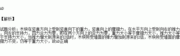 如图所示,质量为m的木块被水平推力压着,静止在竖直墙壁上,当推力F的大小增加到2F时,则( )