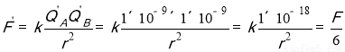 有两个完全一样的金属小球A.B,带电量QA=2×10-9C,QB=-3×10-9C,固定于相距为r的两点上,A.B间作用力为F。用一带绝缘柄的不带电的并且与A.B等大的金属球C先去接触A,再同B接触,最后移去C,则此时A.B间作用力为( )