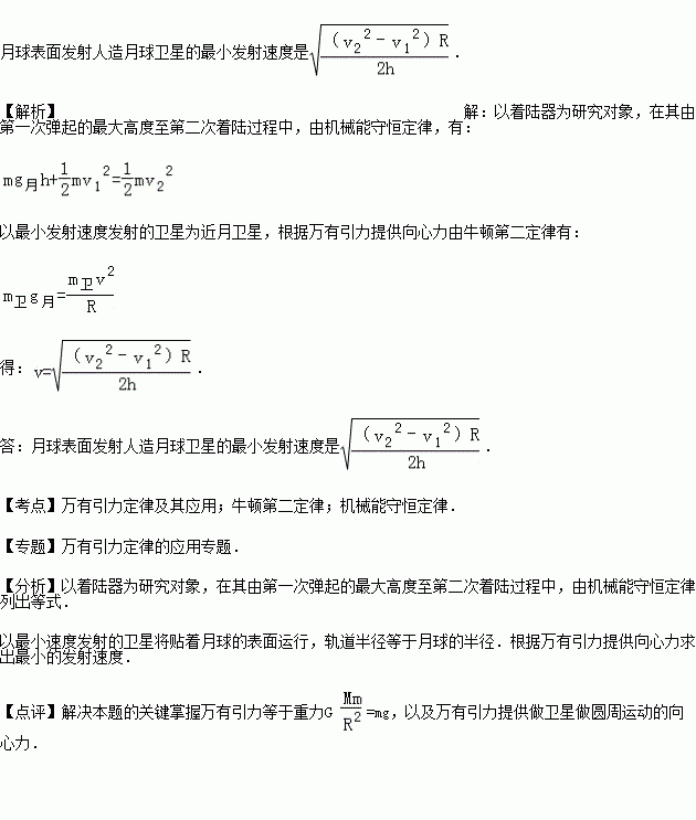 中国计划在2017年实现返回式月球软着陆器对月球进行科学探测,届时发射一颗运动半径为r的绕月卫星.登月着陆器从绕月卫星出发,沿椭圆轨道降落到月球的表面上,与月球表面经多次碰撞和弹跳才停下来.假设着陆器第一次弹起的最大高度为h,水平速度为v1,第二次着陆时速度为v2.已知月球半径为R,求:在月球表面发射人造月球卫星的最小发射速度.