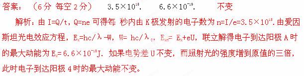 m的紫外线照射阴极尺,光电管阳极A和阴极K之间的电势 差U=2.4V时光电流达到饱和,饱和值为I=0.56 mA.则每 秒内由K极发射的电子数为______.电子到达阳极A时的最大动能为______J(结果均保留两位有效数字).如果电势差U不变,而照射光的强度增到原值的三倍,此时电子到达阳极4时的最大动能______ (填“变大”“不变”或“变小”)已知普朗克常量h=6.63×l0-31J.s,光 速 c=3.0×108 m/s,电子电荷量 e=1.6×10-19 C