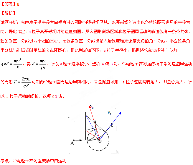 如图所示,圆形区域内有垂直纸面的匀强磁场,两个质量和电荷量都相同的带电粒子a、 b,以不同的速率沿着A0方向对准圆