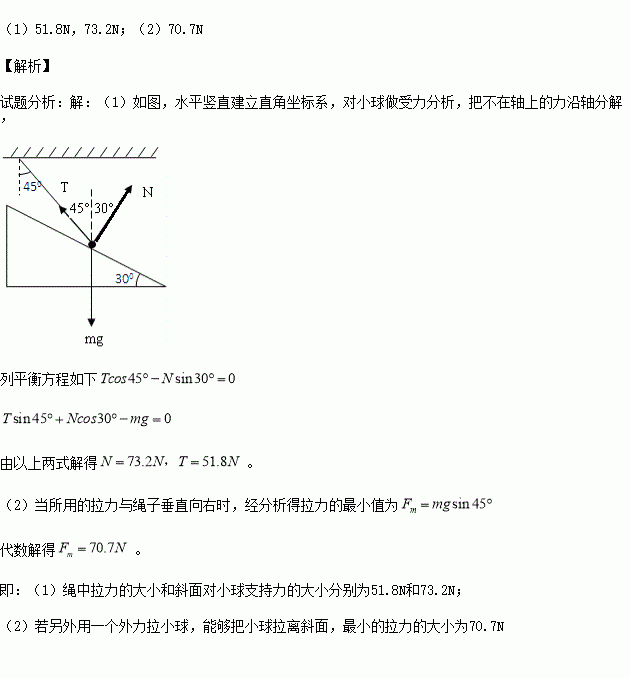 如图所示,光滑固定斜面上有一个质量为10kg的小球被轻绳拴住悬挂在天花板上,已知绳子与竖直方向的夹角为450,斜面倾角为300,整个装置处于静止状态。(g=10m/s2)求:(所有结果均保留三位有效数字)
