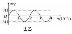 将阻值为100Ω的电阻丝绕成一个110匝的闭合矩形线圈,让其在匀强磁场中绕垂直于磁场方向的轴匀速转动,产生的感应电动势如图乙所示。则可以判断( )
