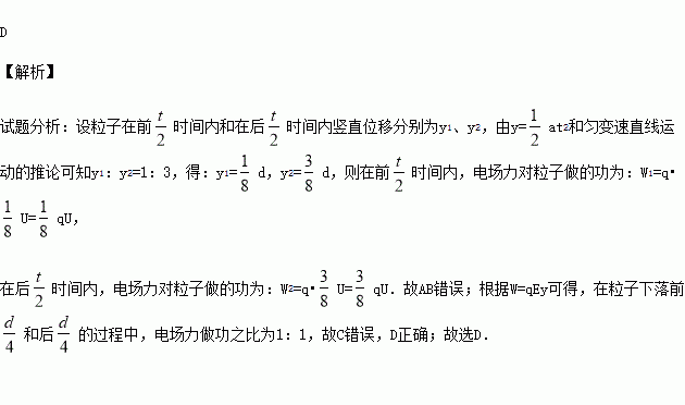 如图,两平行金属板水平放置,板长为L,间距为d,板间电压为U,一不计重力电荷量为q带电粒子以初速度v0沿两板的中线射入,恰好沿下板的边缘飞出,粒子通 过平行金属板的时间为t,则( )